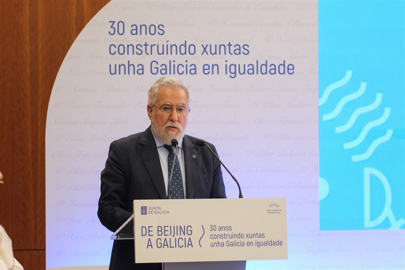 Por otra parte, el titular del Legislativo recordó que la Cámara gallega fue «pionera» al constituir en 1994 la Comisión para la Igualdad y para los Derechos de las Mujeres. Además, fue la primera en aprobar por unanimidad la Declaración y Plataforma de Acción de Beijing, con el objetivo de llevar a cabo medidas políticas prácticas. En cuanto a leyes en materia de igualdad, en el Parlamento se aprobaron la Ley para la igualdad de mujeres y hombres y la Ley del trabajo en igualdad de mujeres en Galicia, así como la Ley para la prevención y tratamiento integral de la violencia de género.