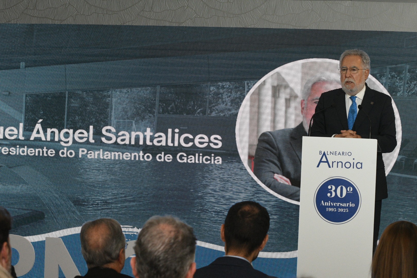 Santiago, 18 de octubre de 2025.- El presidente de la Cámara autonómica, Miguel Ángel Santalices Vieira, destacó esta mañana en el acto de conmemoración del 30º aniversario del Balneario de Arnoia que “Galicia es un referente como destino de turismo de salud".