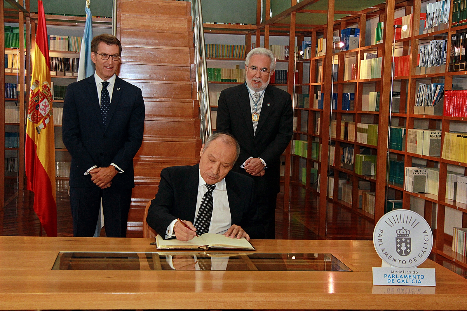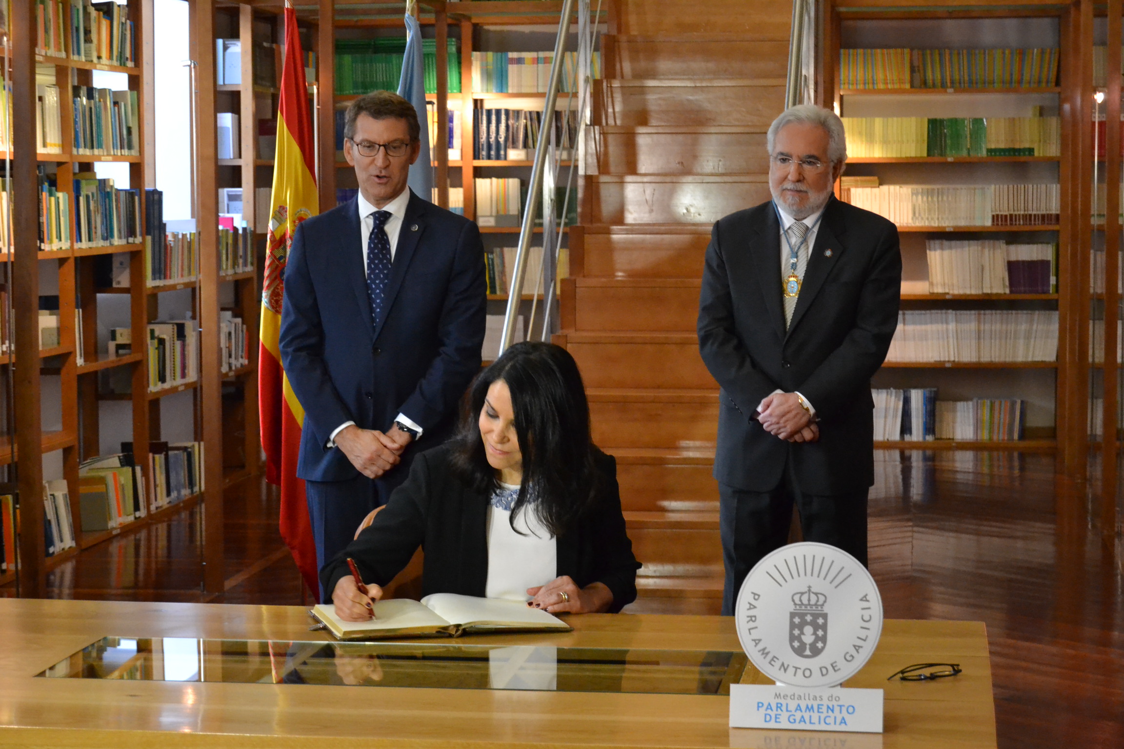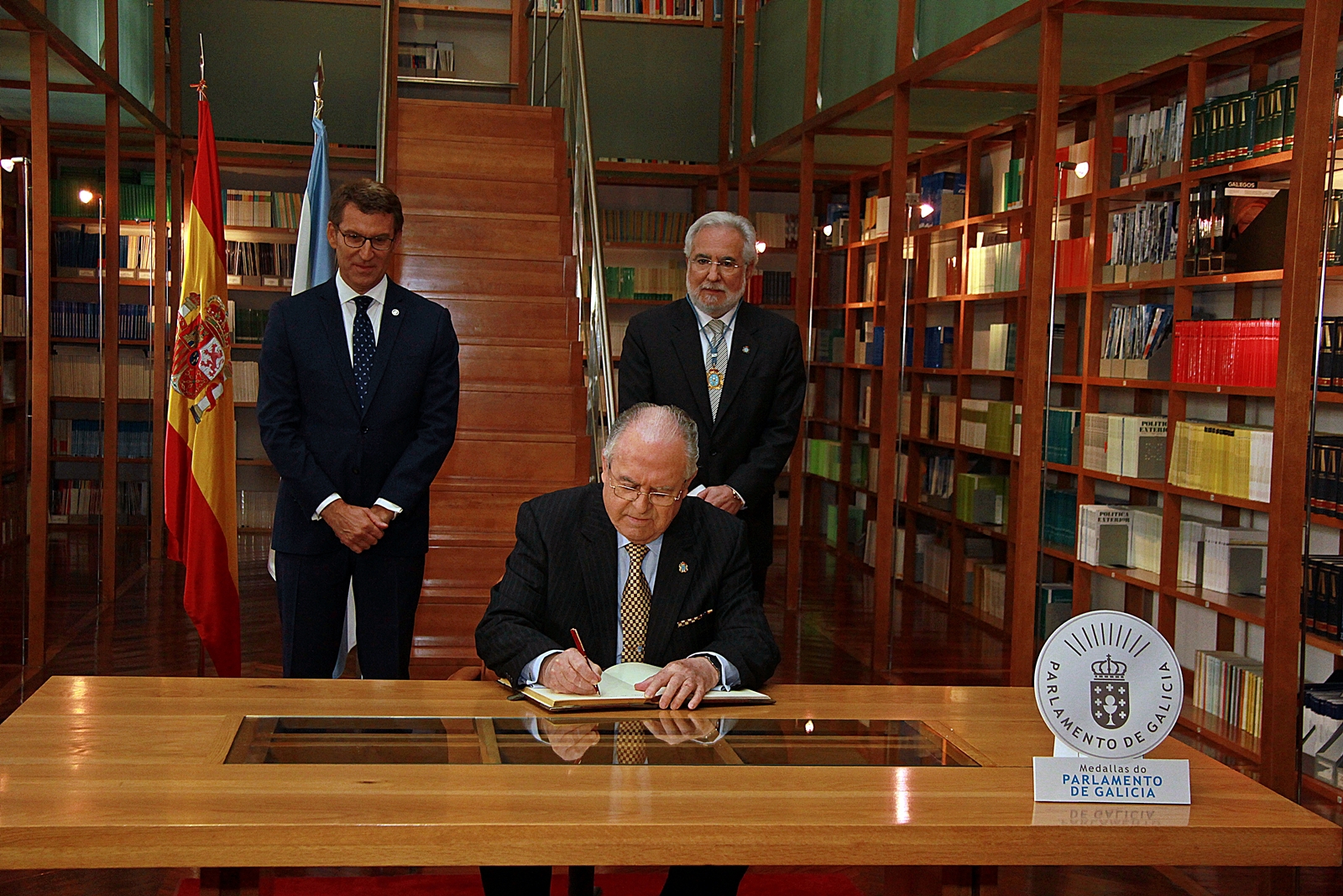 Firma de los homenajeados en el Libro de oro del Parlamento. Presidentes del Parlamento y de la Xunta de Galicia